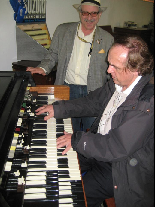 Jon Hammond with Professor Klaus Maier Founding Father of Hammond Suzuki Deutschland at the orgel in HSD Headquarters Langenau